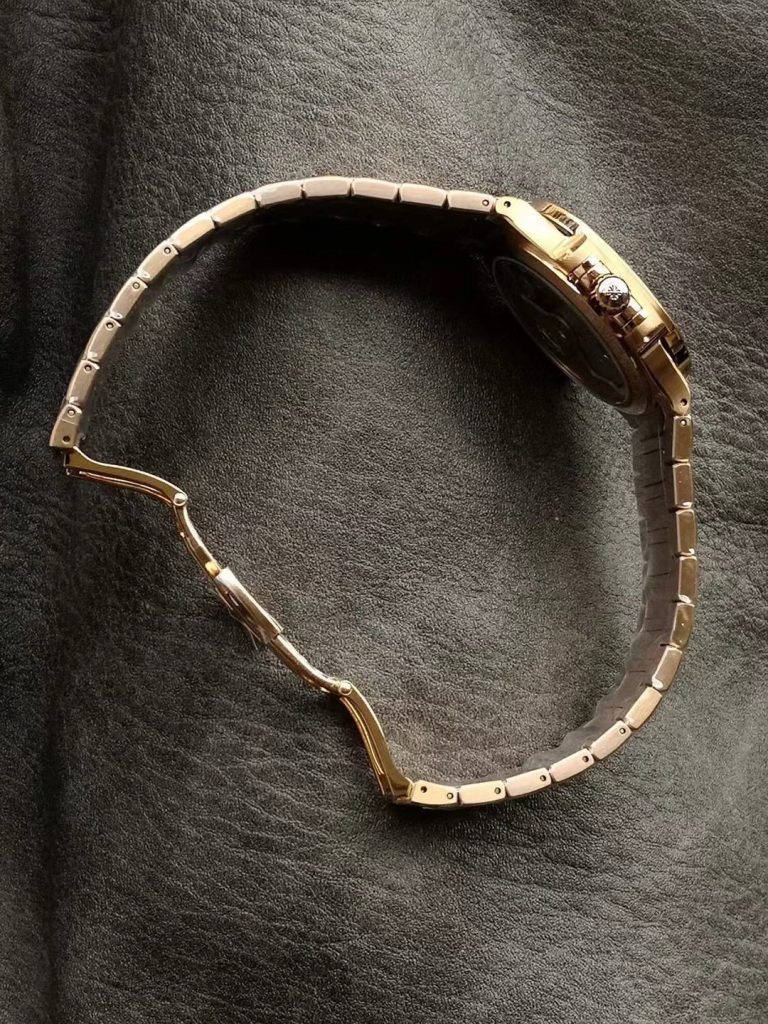 - 象徴的なウェーブデザイン: ローズゴールドカラーの文字盤には、レディース・ノーチラスを象徴する柔らかなウェーブパターンが刻まれており、光の当たる角度によって豊かな表情を見せます。