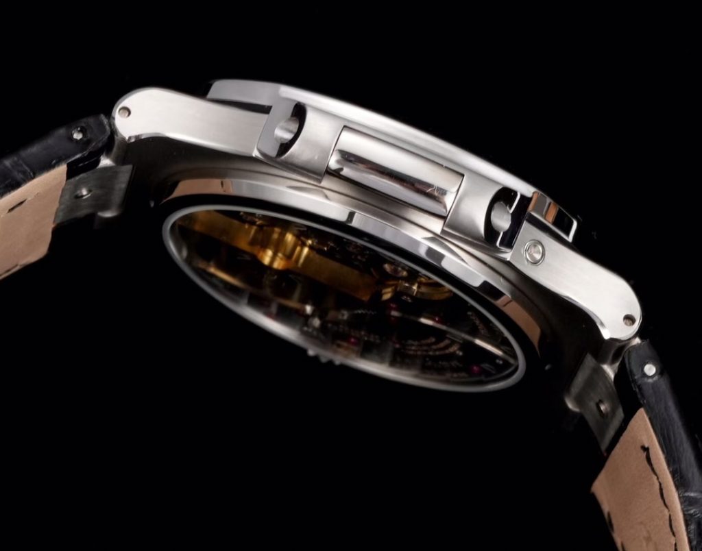 A2: ケースサイズは40mmです。正面はサテン仕上げ、側面はポリッシュ仕上げとオリジナル同様の組み合わせを採用しており、ラグの面取り(イーグルビーク)まで完璧に同期された非常に高いクオリティを誇ります。
