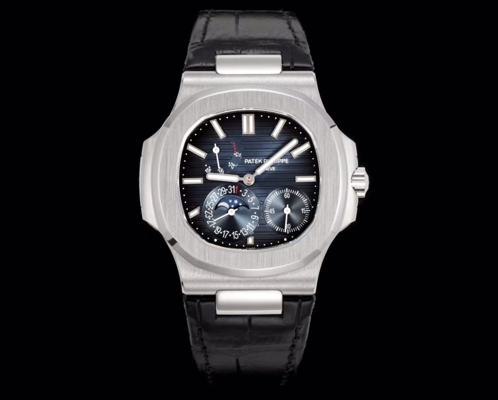 - 複雑機構の完全再現: 特徴的な水平エンボス加工が施された文字盤には、パワーリザーブ表示、日付と連動するムーンフェイズ、そしてスモールセコンドが配置されており、本物さながらのオーラを放ちます。